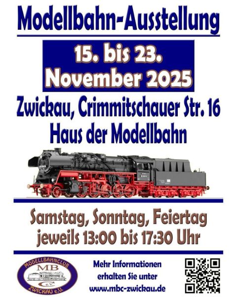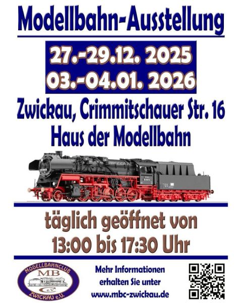 Auch im Jahr 2025 wird der Modellbahnclub Zwickau e.V. im Haus der Modellbahn in der Crimmitschauer Straße 16 (Ecke Platz-der-Völkerfreundschaft) eine Modellbahnausstellung ausrichten. Dazu möchten wir alle großen und kleinen Gäste aus Nah und Fern willkommen heißen.